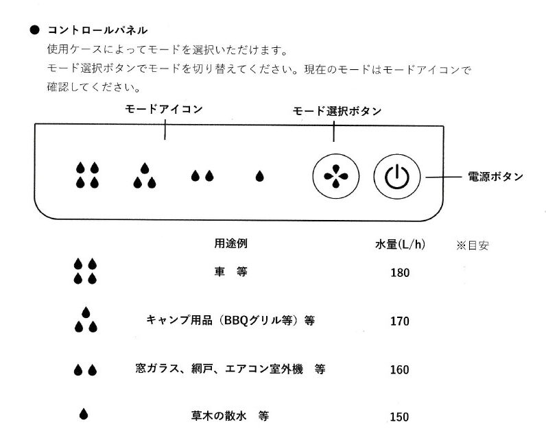 ミラブルはトリガーガンで4つのモードが切り替えができ、さらに水量も4段階に切り替え可能だ