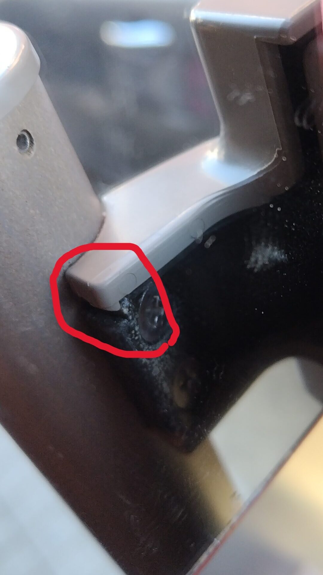 内側の上と下両方の目隠しを外す必要がありますが、以下のように爪があります。(爪が分かるように鏡に映してみました。