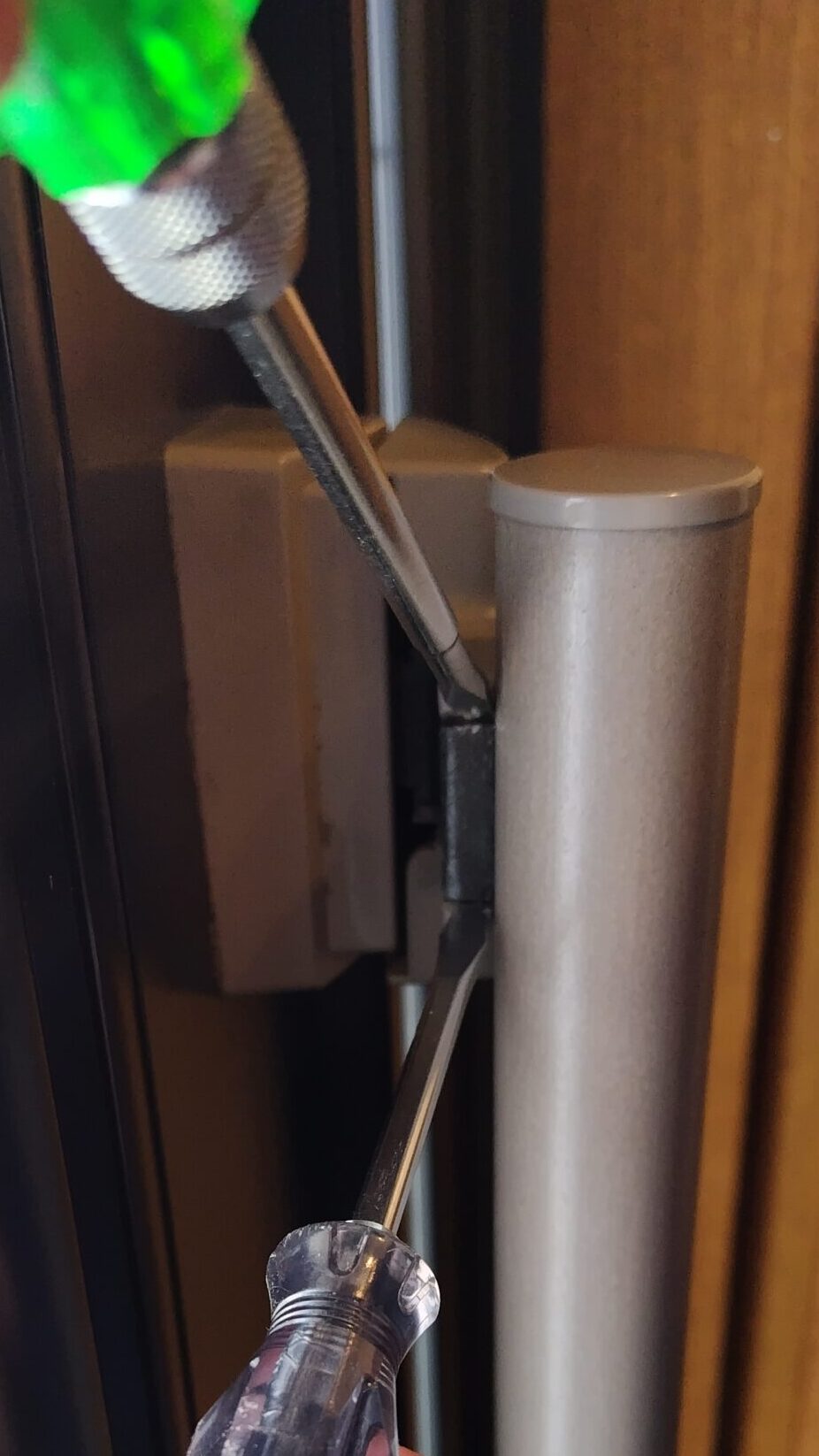 目隠しが外れたら、あとは内側の取っ手の付け根に2本、上下で計4本あるので、外します。
